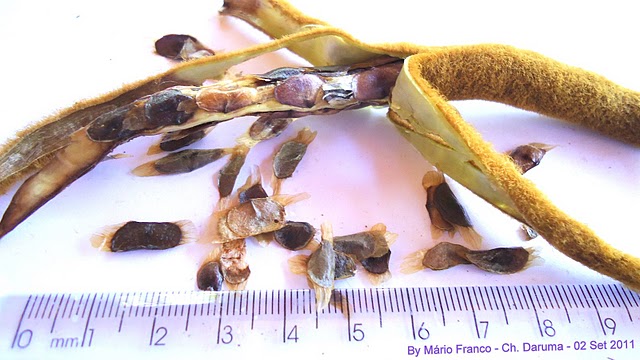 Frutificação: Os frutos, que são legumes escuros e compridos, com sementes duras, brilhosas e rajadas, amadurecem nos meses de agosto a outubro.